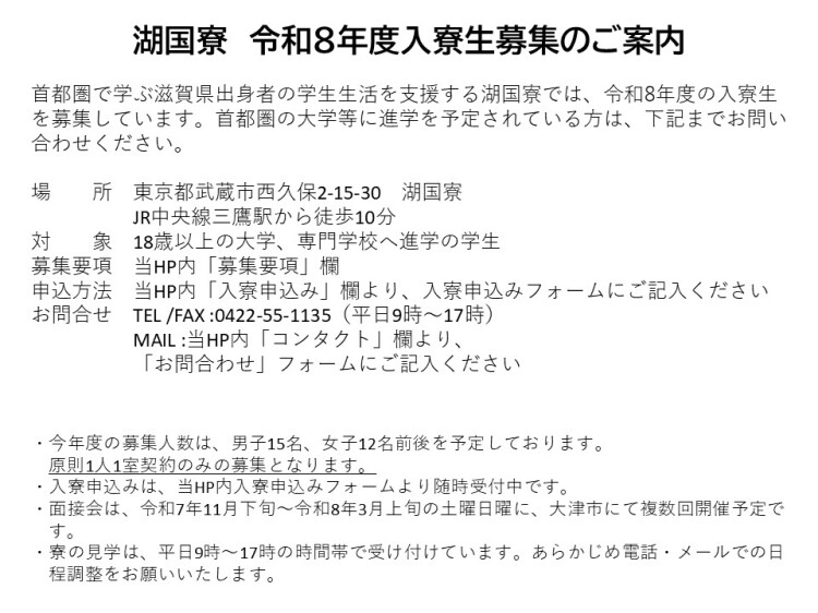 湖国寮の寮祭「さざなみ祭」を、11月9日(日)に開催いたします。今年も恒例の餅つき大会、滋賀県の物産販売や子どもに人気の射的、スーパーボールすくい、恒例の豪華景品が当たる? ビンゴ大会を行います。近隣の皆様、OBOGの皆様ほか、ぜひ湖国寮でお待ちしております。